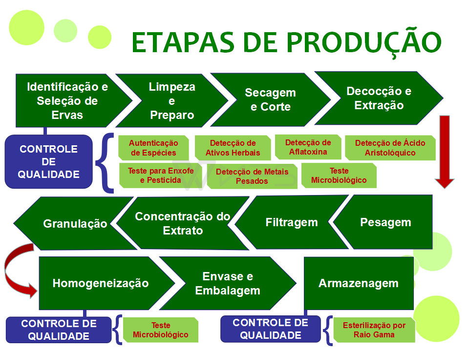 IDENTIFICAÇÃO E SELEÇÃO DAS ERVAS > LIMPEZA E PREPARO > SECAGEM E CORTE > DECOÇÃO E EXTRAÇÃO > PESAGEM > FILTRAGEM > CONCENTRAÇÃO DO EXTRATO > GRANULAÇÃO > HOMOGENEIZAÇÃO > ENVASE E EMBALAGEM > ARMAZENAMENTO
